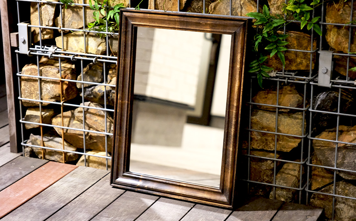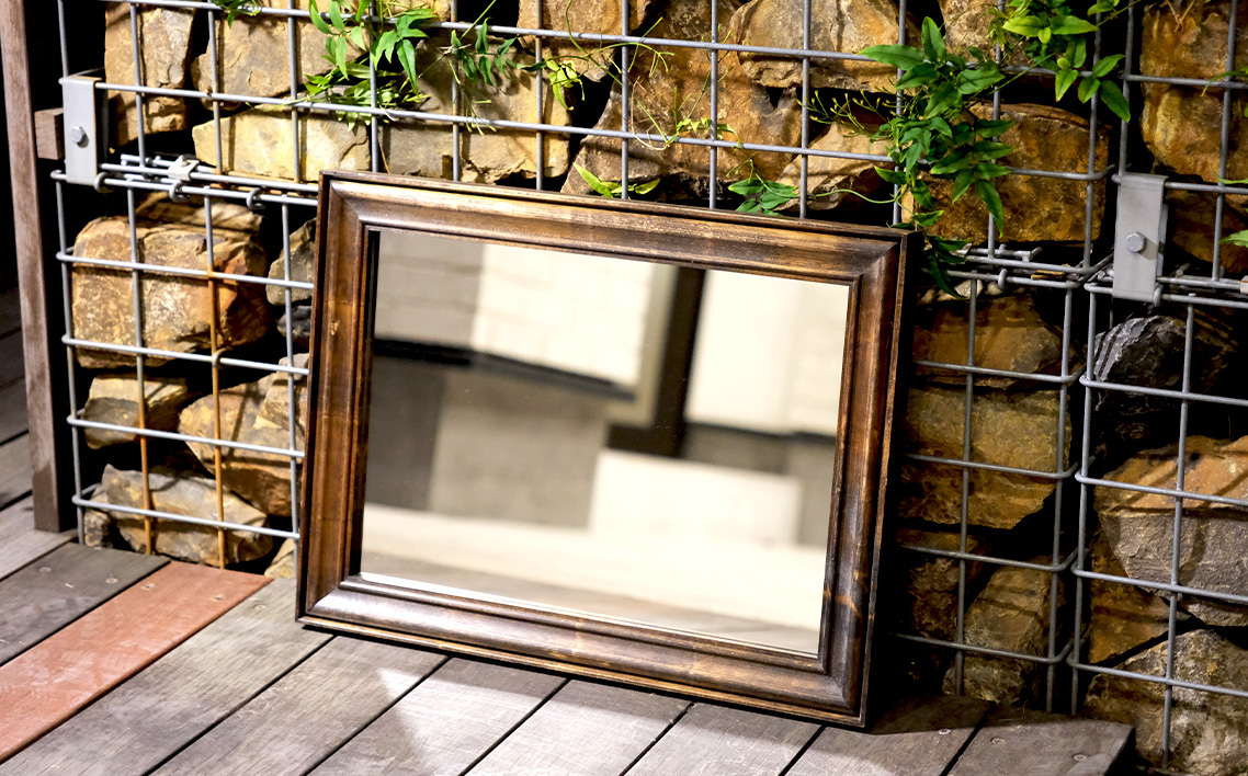 無垢のヒノキを使用したウォールミラーは、アンティークインテリアやカフェ装飾、リビングの壁掛けとしても人気です。
