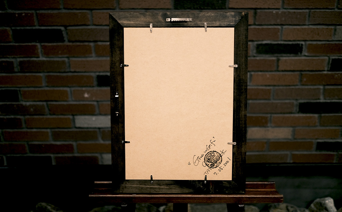 ※額縁の裏側に修理の際に分かるよう、【木の種類・塗装の種類・制作日】を記載し、スタンプが押してあります。