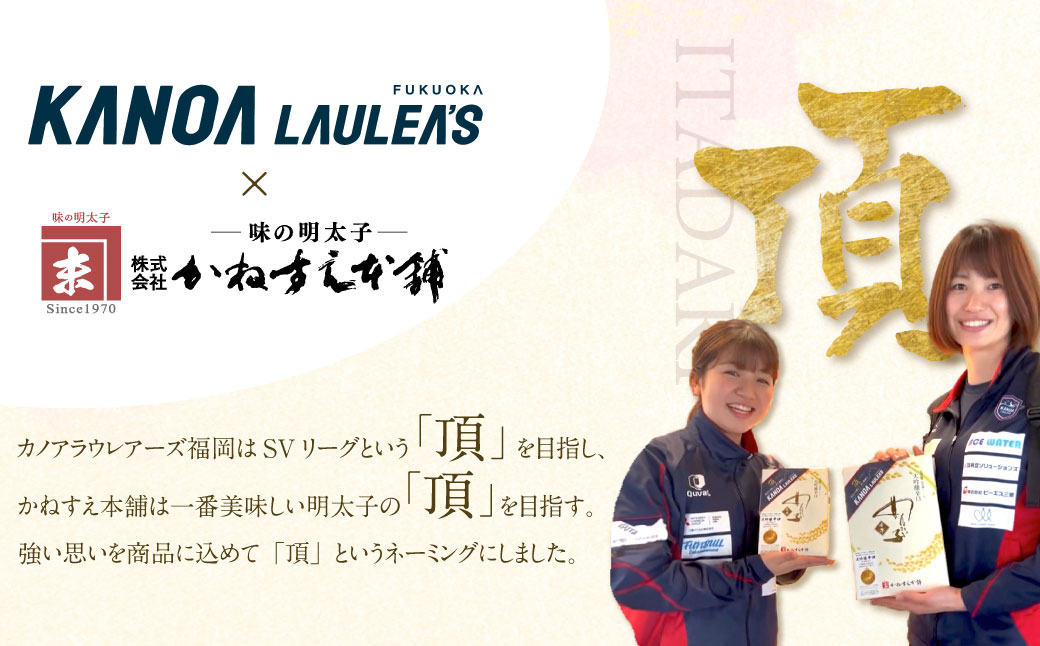 カノアラウレアーズ福岡はSVリーグという「頂」を目指し、かねすえ本舗は一番美味しい明太子の「頂」を目指すという強い思いを商品に込めて「頂」というネーミングにしました。