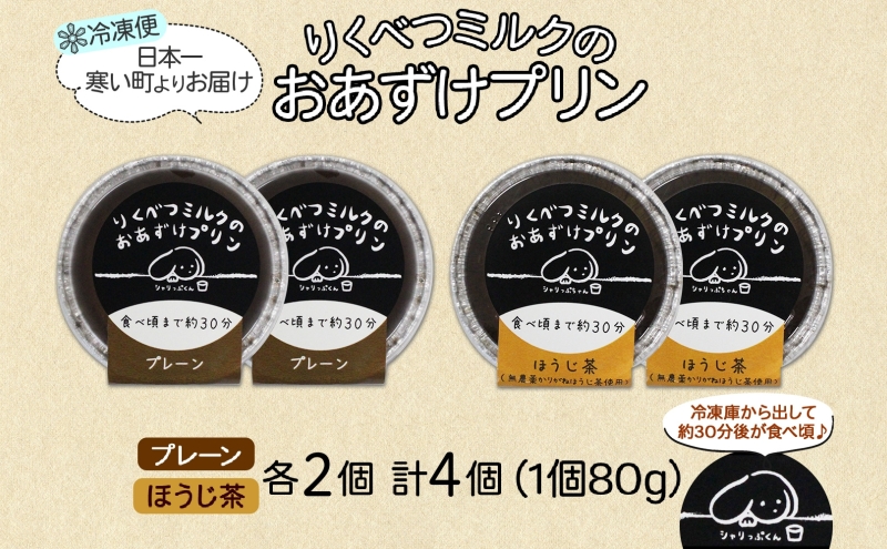 北海道・陸別町から「りくべつミルクのおあずけプリン2種 プレーン&ほうじ茶 計4個」をお届けします。