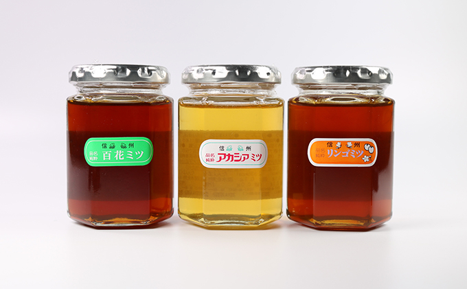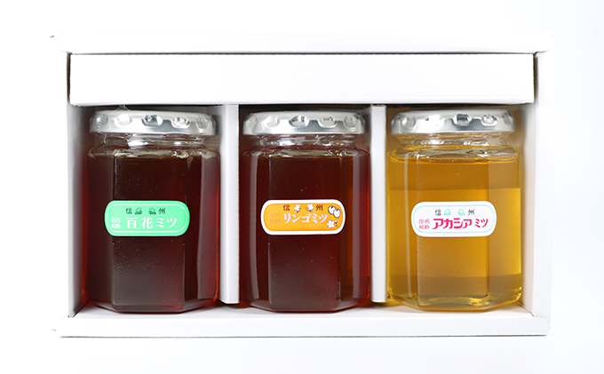 信州産アカシア蜂蜜、信州産百花蜂蜜、信州産リンゴ蜂蜜 各165g 各1本 計3本 化粧箱入り