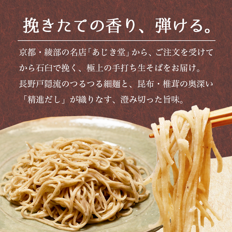 ふるさと納税を通じて、京都・綾部の里山で打つ「あじき堂」こだわりの手打ちそばを、全国のご家庭にお届けできることを嬉しく思います。特に、ご注文をいただいてから石臼で挽く蕎麦粉の「挽きたての香り」は、当店が最も大切にしている点です。動物性食材不使用の「精進だし」と共に、蕎麦本来の力強い風味と澄んだ旨味を、ぜひご自宅で感じていただきたいです。この蕎麦が、綾部の地と皆様を繋ぐきっかけになれば幸いです。