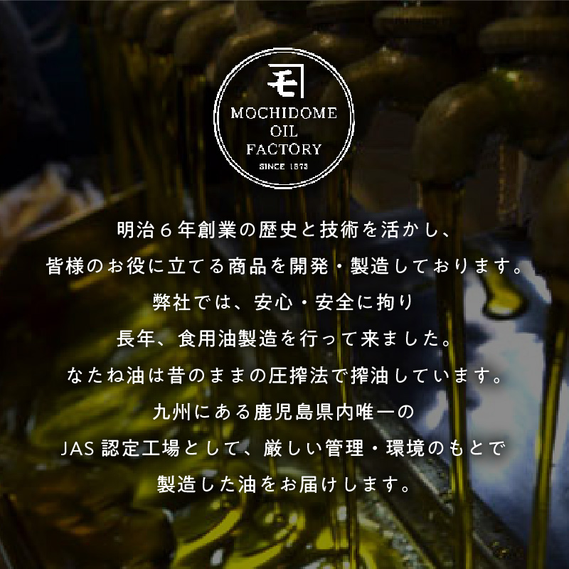 圧搾法により搾られた昔ながらの油で菜種油独特の風味や色を残しています。