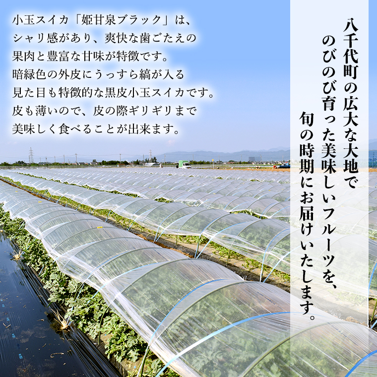 小玉スイカ「姫甘泉ブラック」は、シャリ感があり、爽快な歯ごたえの果肉と豊富な甘味が特徴です。