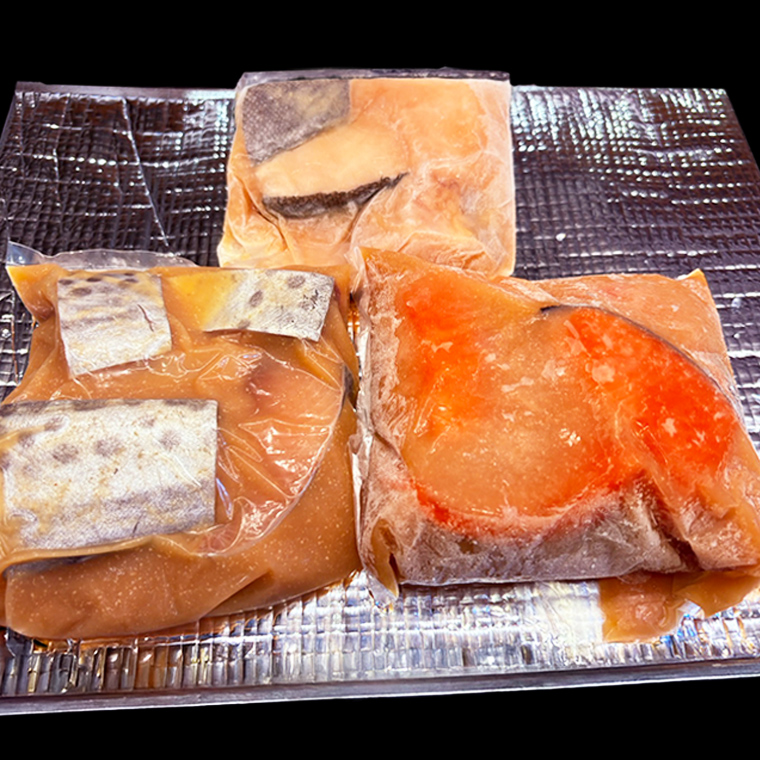 天然のノルウェーサーモンと銀たら、さわらを1本丸ごと仕入れて、料亭の調理場で丁寧に仕込んだお礼品です。