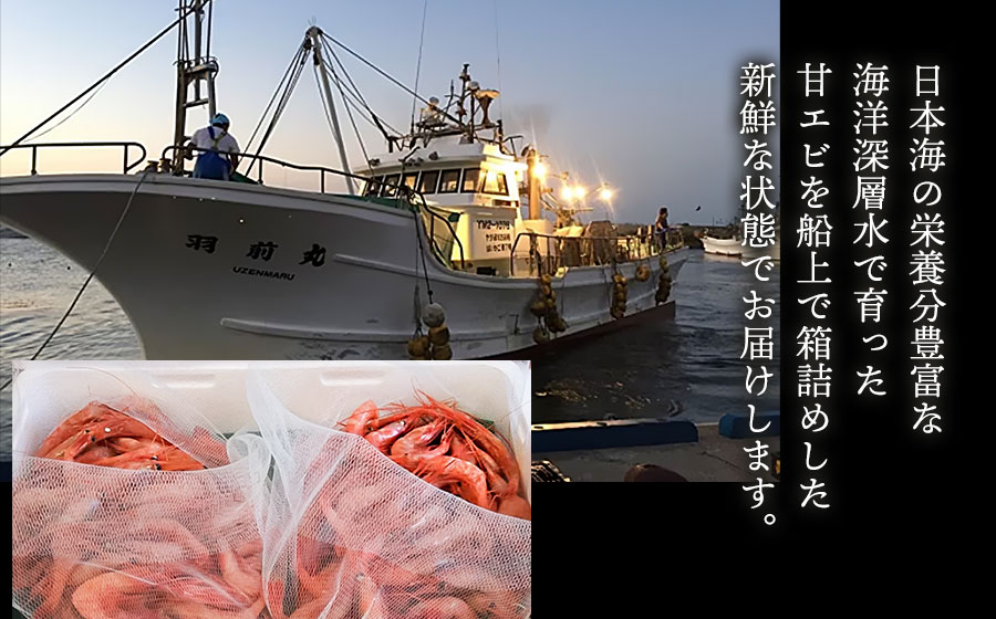 海老 甘エビ 船上箱詰め 新鮮 採れたて 1.1kg 刺身 味噌汁 唐揚げ 酒蒸し 海老づくし 東北 山形 鶴岡 庄内浜 日本海 鼠ヶ関 羽前丸 冷蔵