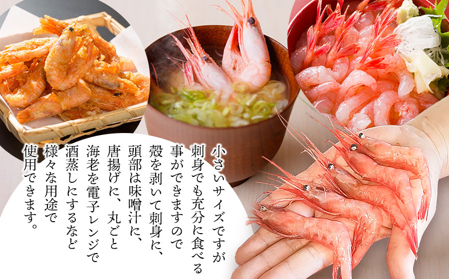 小さいサイズですが刺身でも充分食べる事ができますので、殻を剥いて刺身に、頭部は味噌汁に、唐揚げに、丸ごと海老を電子レンジで酒蒸しにするなど様々な用途で使用できます。