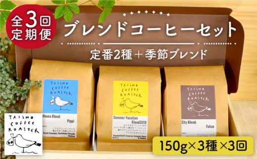 定番ブレンドコーヒー2種150g+季節ブレンドコーヒー150gを毎月1回、3ヶ月連続でお送りします。