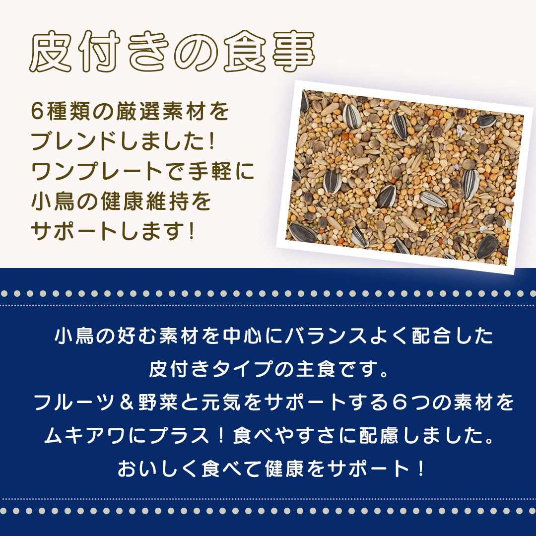 小鳥の好む素材を中心にバランスよく配合した皮付きタイプの主食です。