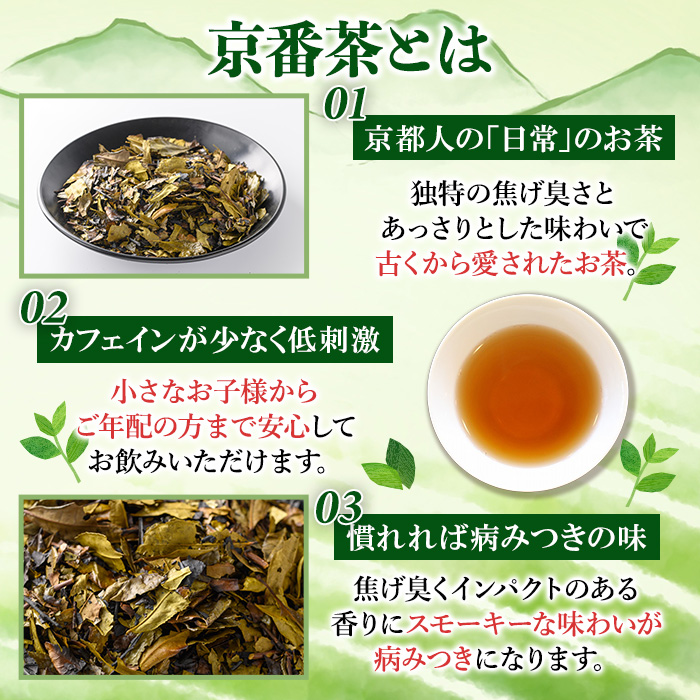 独特の焦げ臭さとあっさりとした味わいがあり京都人の「日常」で飲むお茶として古くから愛されています。