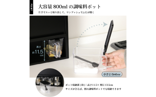 下段には砂糖や塩などの調味料ポット収納。大容量800mlの調味料ポットを付属。