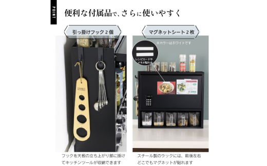 4つの収納で、スパイスも調味料も効率的に使いやすく収納できます。