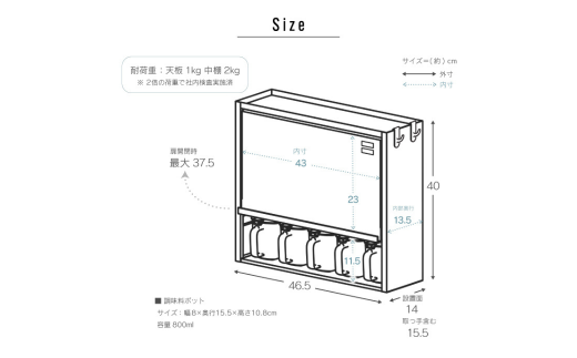 - ●サイズ:本体/約 幅46.5×奥行15.5×高さ40cm ポットサイズ/約 幅8×奥行15.5×高さ10.8cm ●有効内寸:フラップ扉収納部/約 幅43×奥行13.5×高さ23cm ポット収納部/約 幅43×奥行13.5×高さ11.5cm ●ポット容量:1杯あたり(800ml) ●重量:4.0kg ●カラー:ブラック ●材質:本体/スチール(アクリル塗装)、調味料ポット/(本体)ポリスチレン(フタ・スプーン)ポリプロピレン ●耐荷重:天板/1kg、中棚/2kg ●付属品:ポット×5個、スプーン×5個、フック×2個、マグネットシート×2枚