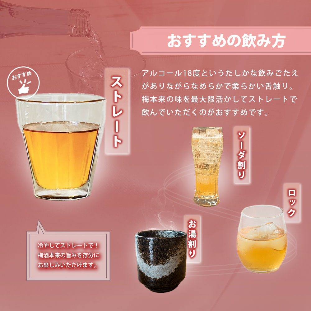 ロックや炭酸割り・お湯割りでも楽しめる、芋焼酎が苦手な方にもぜひお飲みいただきたい梅酒です。