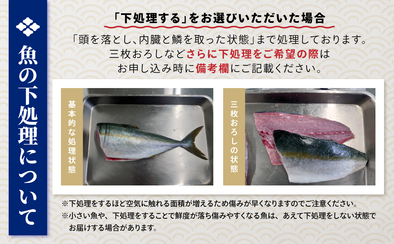 こちらの返礼品は「頭を落とし、内臓と鱗を取った状態」まで処理しております。三枚おろしなどさらに下処理をご希望の際はお申し込み時に備考欄にご記載ください。