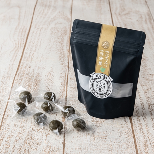【プロポリス入りはちみつ当帰のど飴】天然の抗生物質といわれるプロポリスと、奈良県宇陀市産のはちみつ、奈良県宇陀市産の大和当帰の葉っぱの粉末入りののど飴。 薬草・大和当帰の葉っぱにはビタミンKが豊富に含まれています。プロポリス特有の辛みと、セロリのような当帰葉の風味がまろやかに調和したのど飴です。