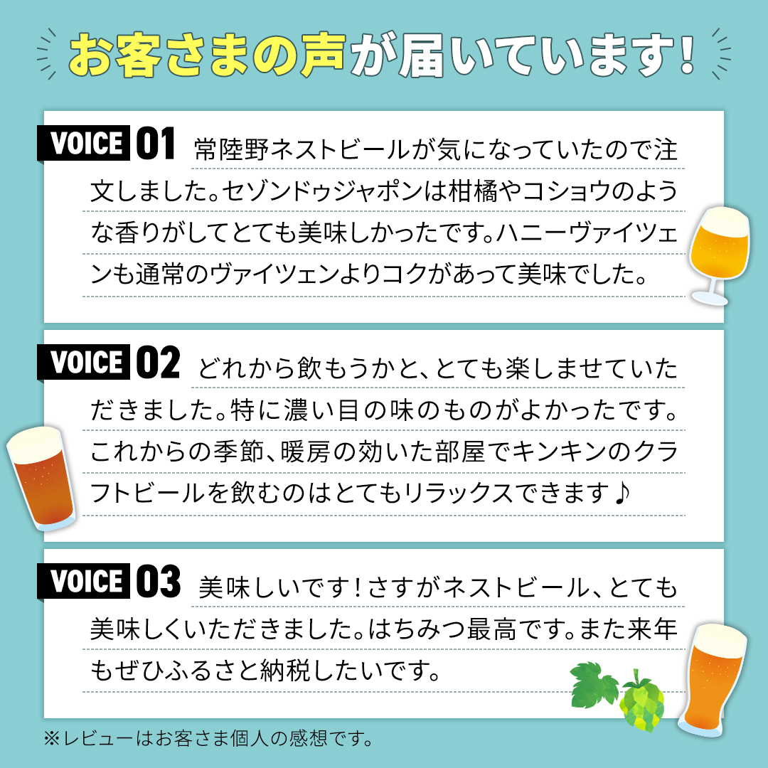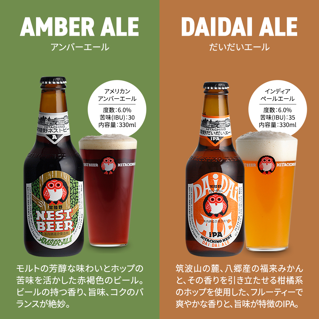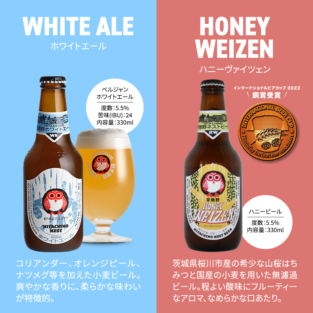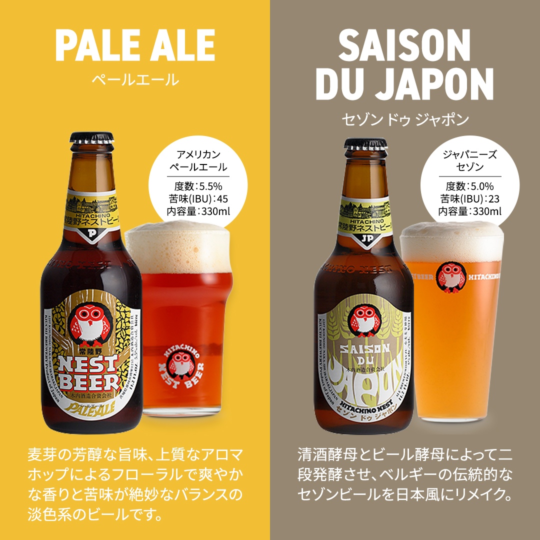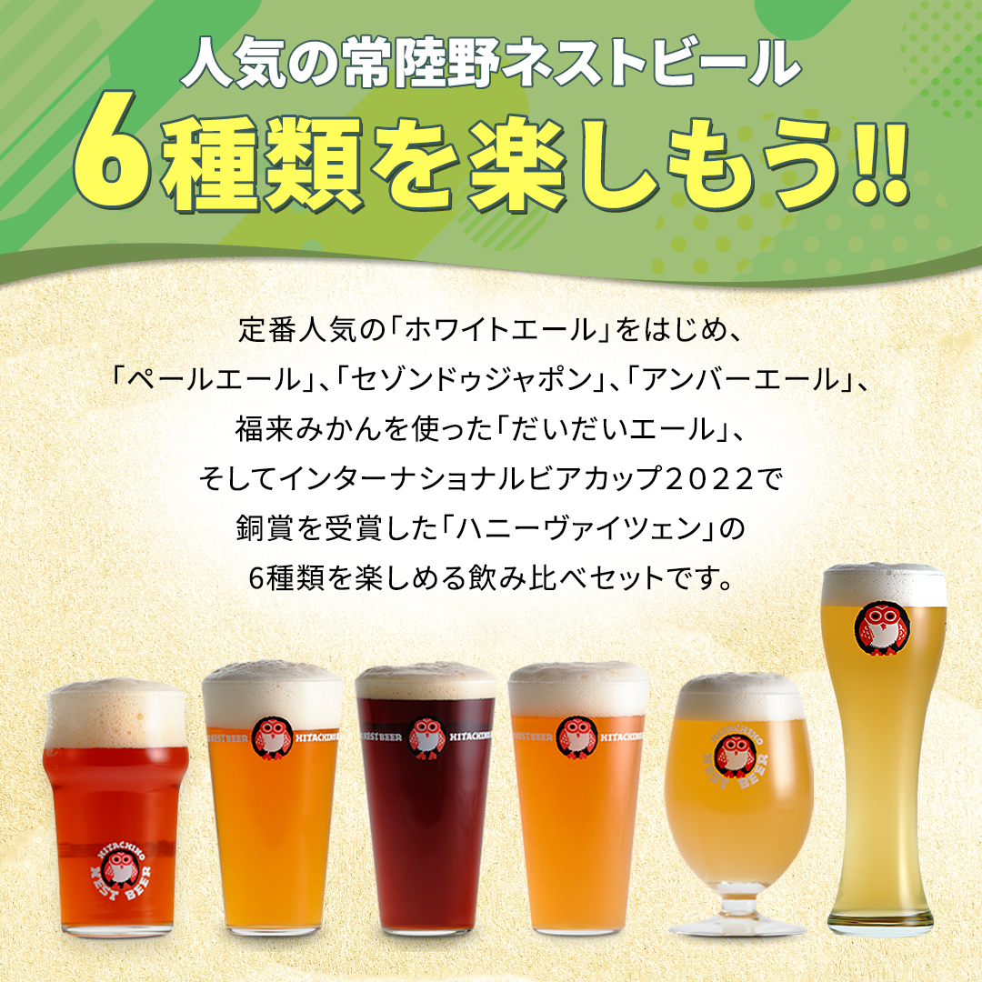 「福来みかん」を使用しただいだいエール、定番人気のホワイトエール、麦芽の香ばしさとほのかな甘味、ホップの華やかな香りが溶け合ったアンバーエール、麦芽の芳醇な旨味、爽やかな香りと苦味ペールエール、ベルギーの伝統的なセゾンビールを日本風にリメイクしたセゾンドゥジャポン。常陸野ネストビール6種を楽しめる飲み比べセットです。