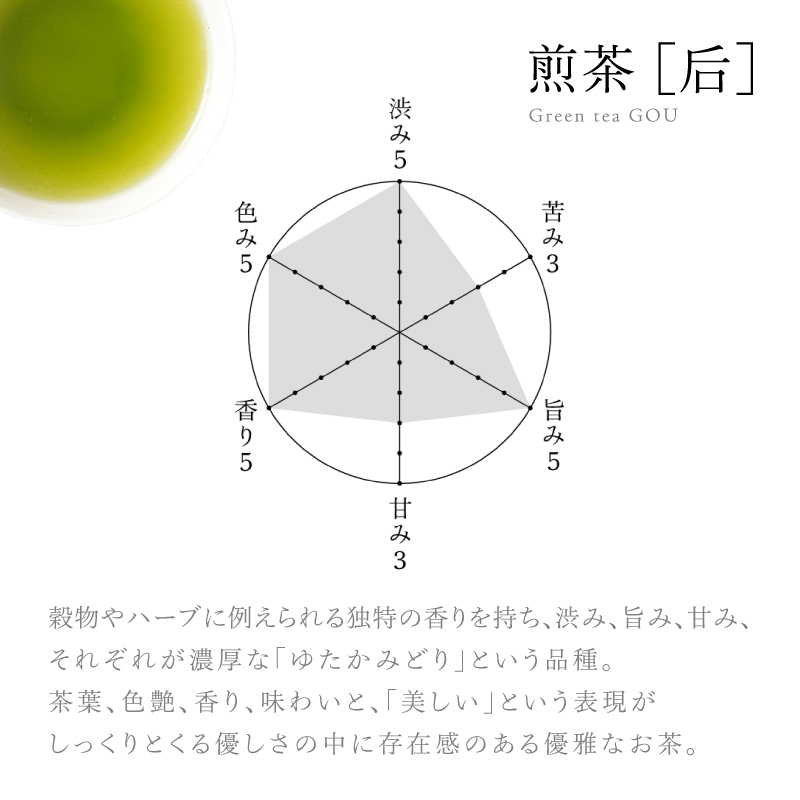 穀物やハーブに例えられる独特の香りを持ち、渋み、旨み、甘み、それぞれが濃厚な「ゆたかみどり」という品種。