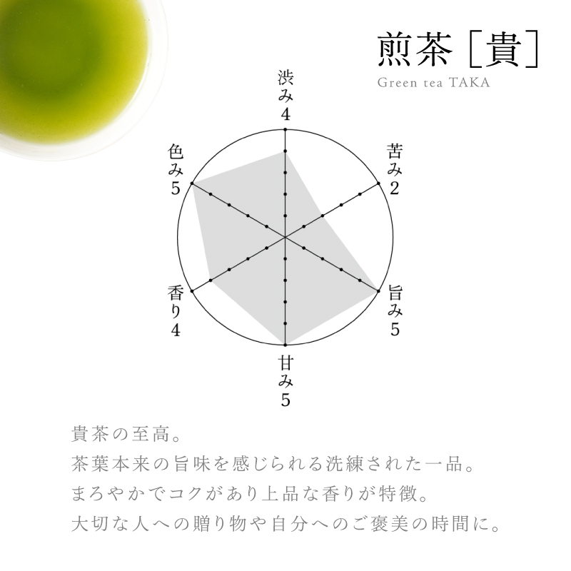 茶葉、色艶、香り、味わいと、「美しい」という表現がしっくりとくる優しさの中に存在感のある最高級のお茶。