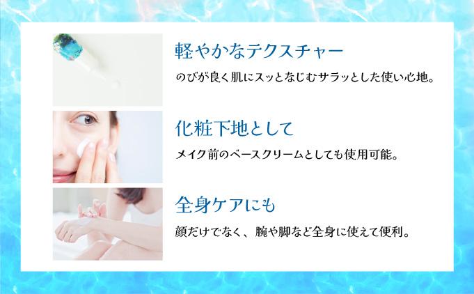 十分な量を手に取りお肌に塗り忘れの無いようにムラなく延ばしてください。延びが良くサラッとしたクリームタイプで化粧下地としてでも全身にもお使い頂けます。