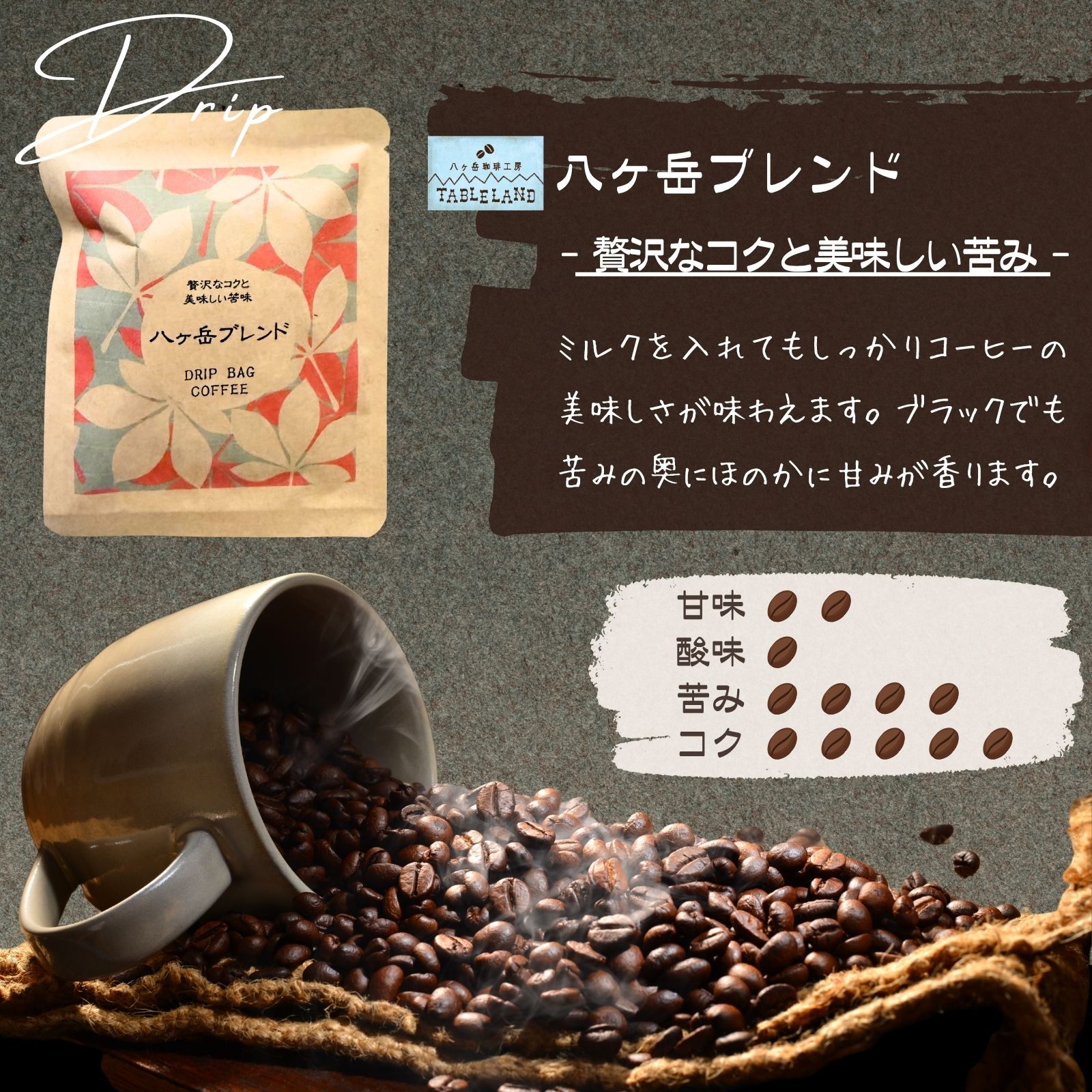 八ヶ岳ブレンドは、贅沢なコクと美味しい苦味の深煎りブレンド。