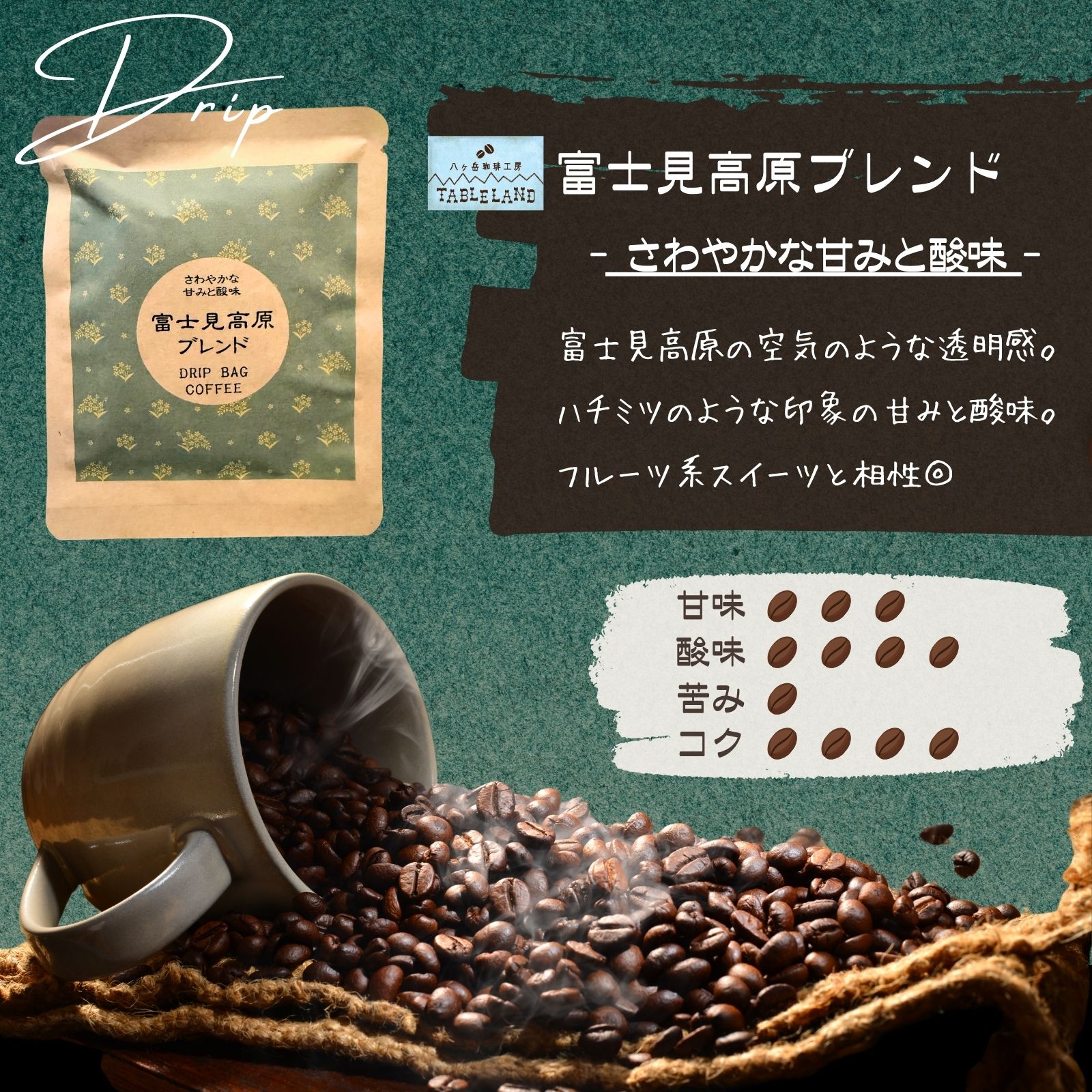 富士見高原ブレンドは、さわやかな酸味と甘みの中煎りブレンド。