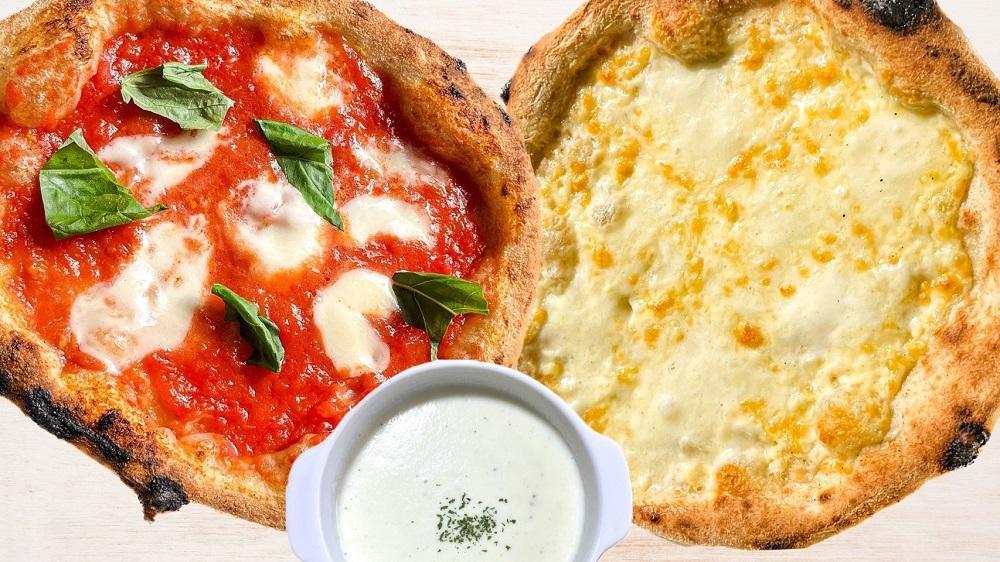 【マルゲリータ2枚、チーズのピザ2枚、ポタージュ8食分のセット】