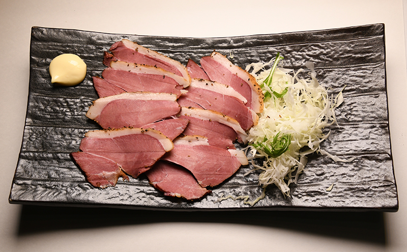 自然解凍後、薄くスライスして軽く炙ってお召し上がりください。燻製の風味が一段とアップします。