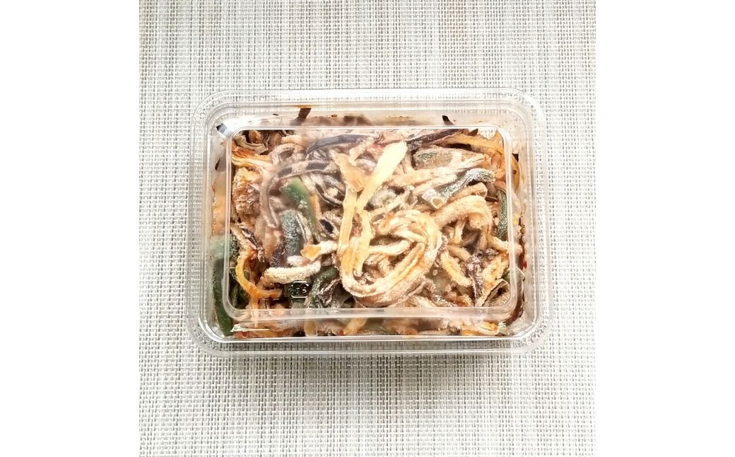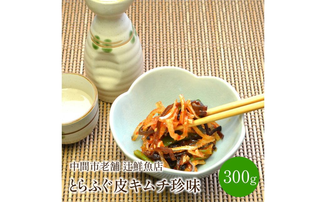 国産とらふぐ(本ふぐ)の皮を贅沢に使用し、山クラゲ、キクラゲと一緒にピリ辛キムチ調味液に漬け込みました。