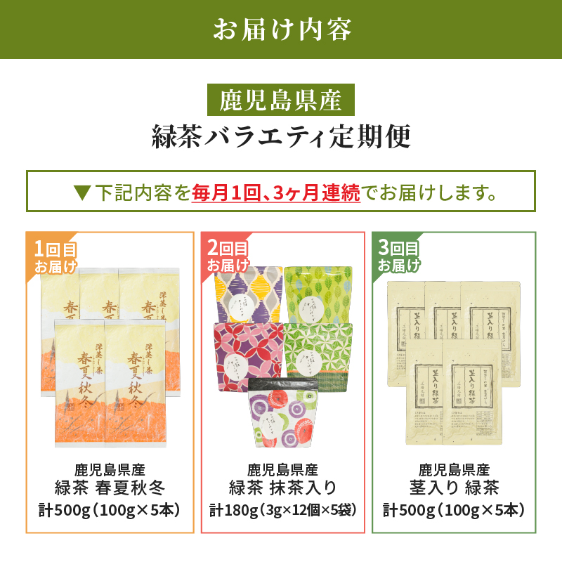 茶 お茶 緑茶 かごしま茶 鹿児島茶 飲料 一番茶 春夏秋冬 抹茶入り ティーバッグ 茎入り緑茶 国産 定期便 定期便 美味しい おいしい バラエティ ホット アイス 3ヶ月連続 全3回 茶一心 ふるさと納税 鹿児島 鹿屋市 おすすめ ランキング プレゼント ギフト KN089-T07