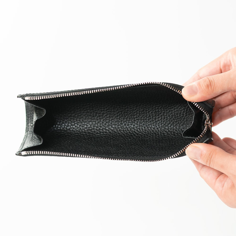 見た目はコンパクトですが、ファスナーを開くとサイドの折り込みマチで内装が大きく開くのがポイント。