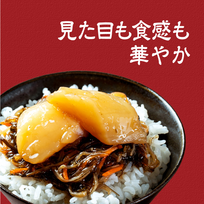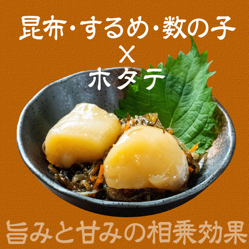ホタテ(北海道産)、塩数の子(数の子、食塩)、清酒、みりん、アミノ酸液調味料、しょうゆ、還元水あめ、砂糖、いか乾製品、昆布加工品(昆布、醸造酢)、人参、食塩、かつお節エキスパウダー/調味料(有機酸等)、酒精、pH調整剤、増粘多糖類、(一部に小麦・いか・大豆を含む)