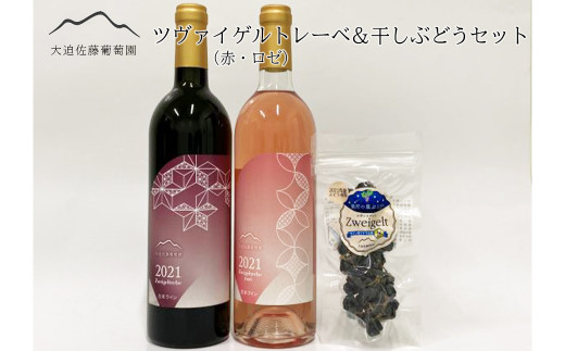 大迫佐藤葡萄園で栽培したぶどうを自園ワイナリーで醸造した、ツヴァイゲルトレーベ赤、ロゼと干しぶどうのセットです。