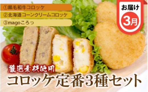 1)お届け月3月:≪コロッケ3種セット≫〈黒毛和牛・コーンクリーム・magoころっ〉(各5個)