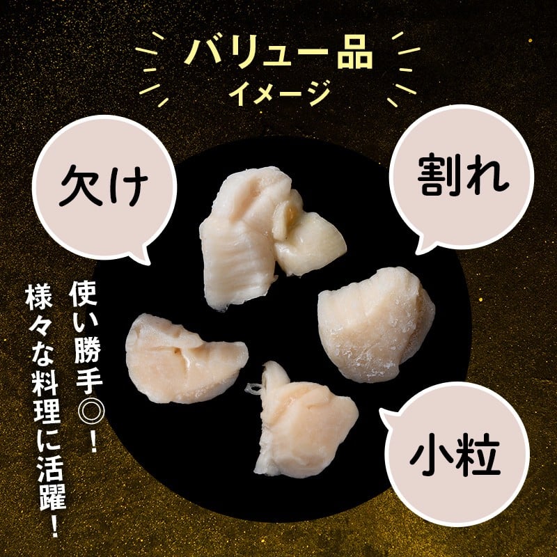 ・玉冷ほたて貝柱につきまして、粒一つ一つの大きさにバラつきがございます。またサイズ不選別で、半分に割れたものや、一部欠けたものが入っておりますが、味に遜色はございません。