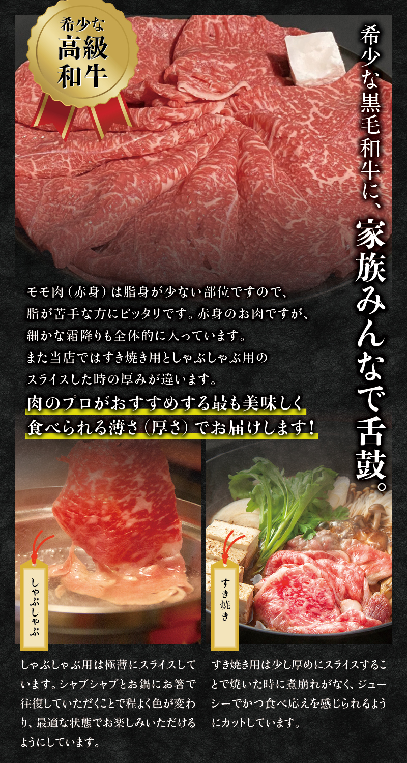 「すき焼き用」は、少し厚めにスライスする事で焼いた時に煮崩れがなく、ジューシーでかつ食べ応えを感じられるようカット。