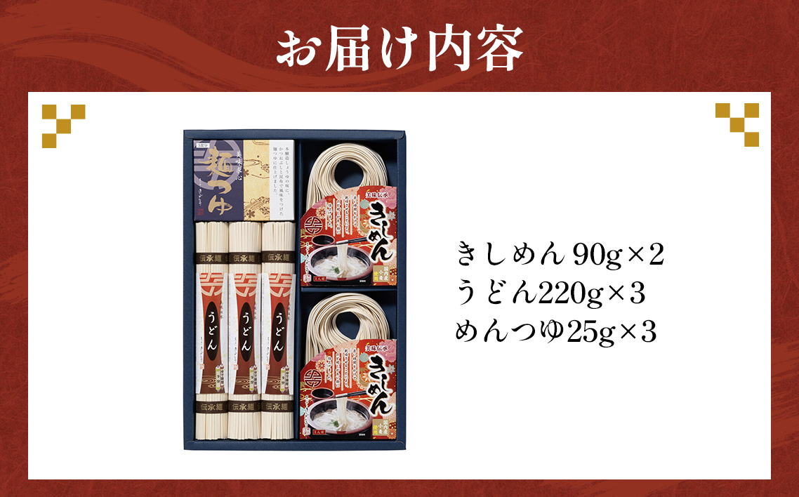 きしめん 90g×2、うどん220g×3、めんつゆ25g×3