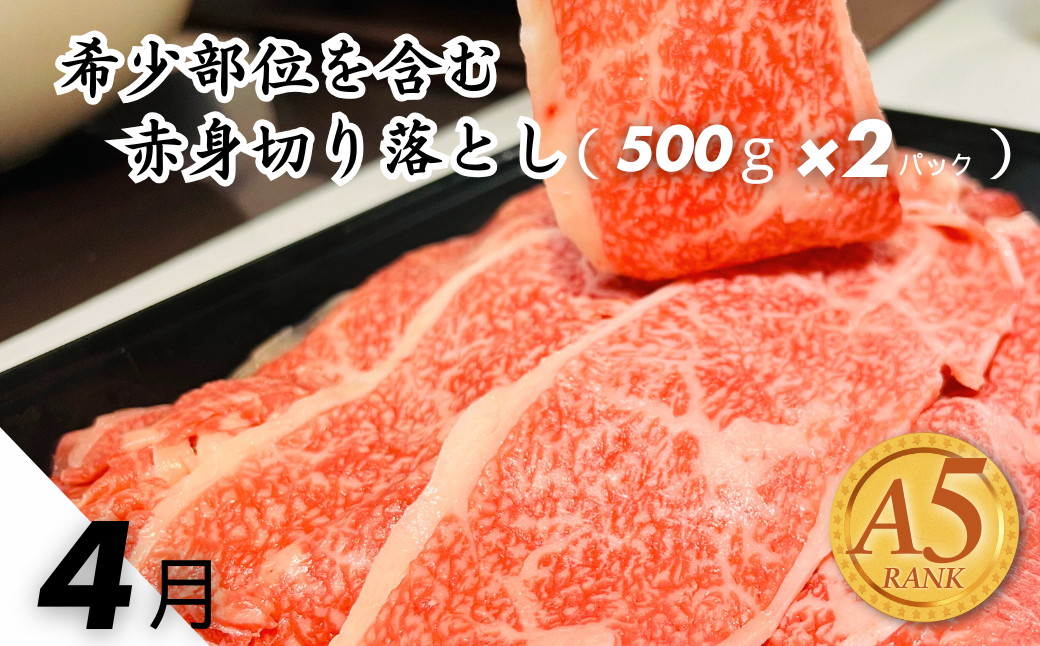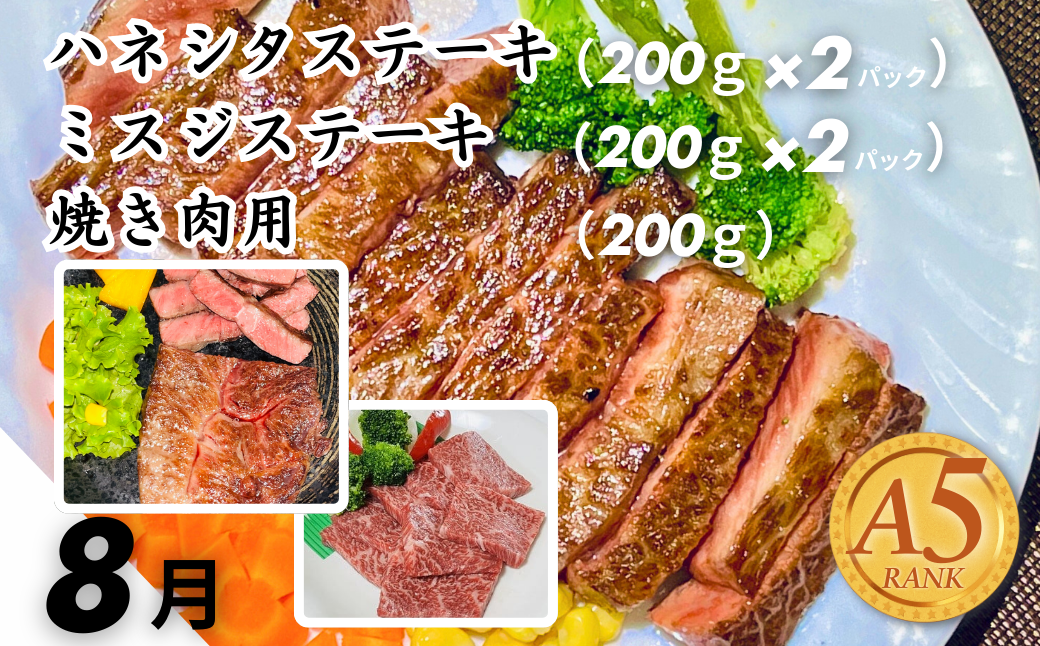 定期便(12月:肩ロース・モモ すき焼き、しゃぶしゃぶ500g×2パック)、(4月:希少部位を含む赤身切り落とし500g×2パック)、(8月:ハネシタステーキ200g×2・ミスジステーキ200g×2・焼き肉200gパック)と各出荷月1kgのプレミアムなお肉を出荷致します。