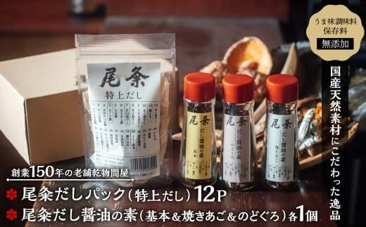 尾粂だしパック(特上だし)12パック(1パック約7g)・だし醤油の素 基本53g、のどぐろ25g、焼きあご21g