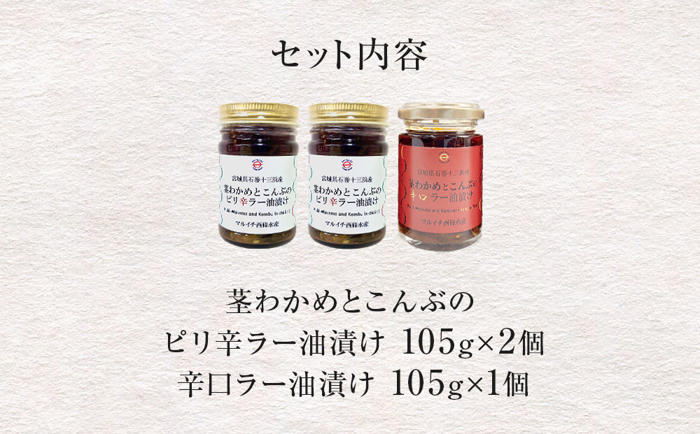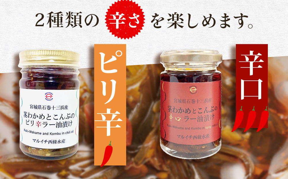 宮城県石巻十三浜で育った茎わかめとこんぶをラー油に漬けました。酸味と辛味の絶妙なバランスと茎ワカメのシャキシャキの食感が美味しく、ごはんが驚くほど進みます。茎わかめとこんぶは自社で養殖したものを利用し、原材料の品質にはこだわっています。
