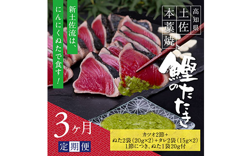 〈かつおのたたき×2節(鰹の大きさには個体差があり、1節約320g〜360g以上)、有機無添加土佐にんにくぬた20ml×2袋、たたきのタレ15ml×2袋、おろしニンニク2g×2袋〉×3ヶ月