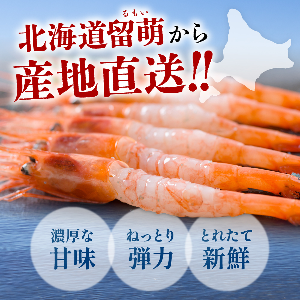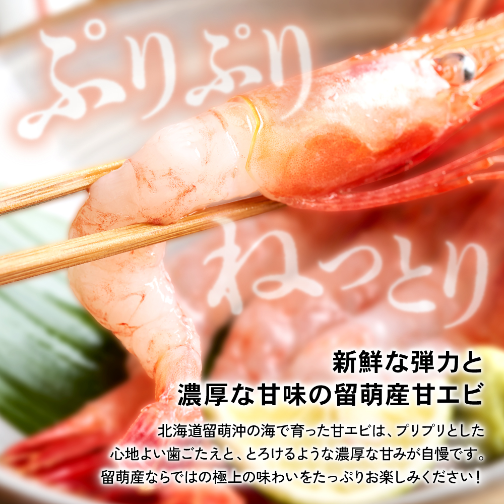 北海道留萌沖で、新星マリン所属の徳漁丸が漁獲した鮮度抜群のナンバンエビです。甘味があり、刺身も最高、塩焼き最高、塩ゆで最高、天ぷら最高で色々な食べ方があります。