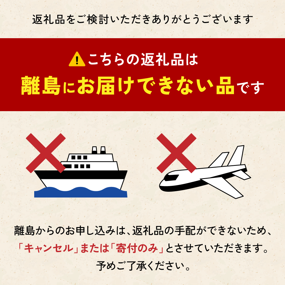 ※上記のエリアからの申し込みは返礼品の手配が出来ないため、「キャンセル」または「寄附のみ」とさせていただきます。予めご了承ください。
