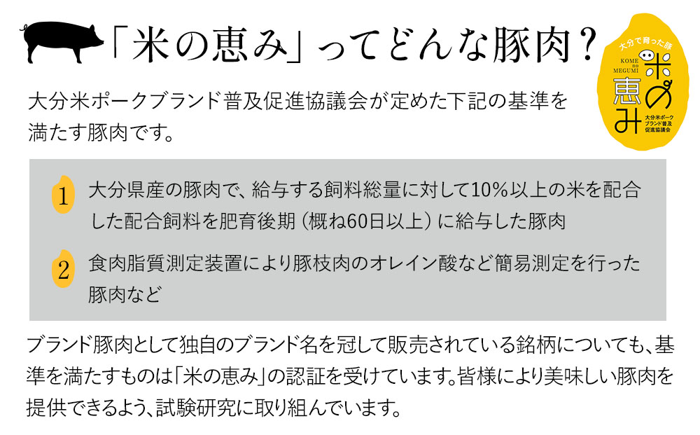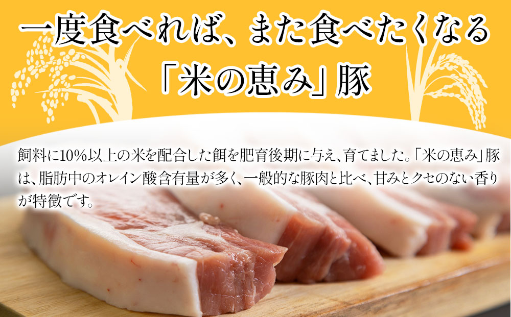 飼料に10%以上の米を配合した餌を肥育後期に与え、育てました。「米の恵み」豚は、脂肪中のオレイン酸含有量が多く、一般的な豚肉と比べ、甘みとクセのない香りが特徴です。