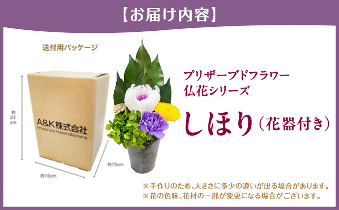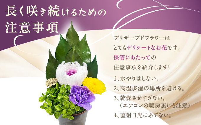 花材と葉材は国内製造のプリザーブド加工とドライ加工されたものだけを厳選した、自然な風合いと清らかさにこだわって仕上げた国産・高品質のプリザーブドフラワーの仏花。