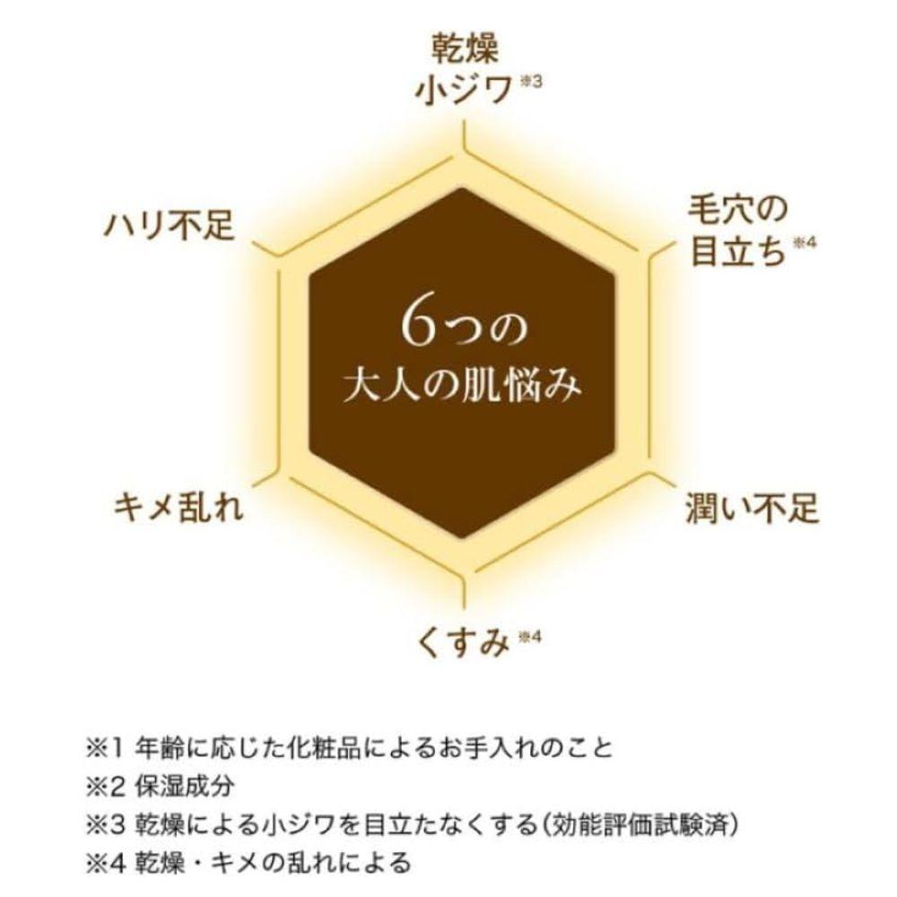 ナノ浸透加工により、角質層に素早くなじんで、年齢とともに現れる“乾燥小ジワ・毛穴の目立ち・潤い不足・くすみ・キメの乱れ・ハリ不足”の6つのお肌悩みをマルチにケアします。