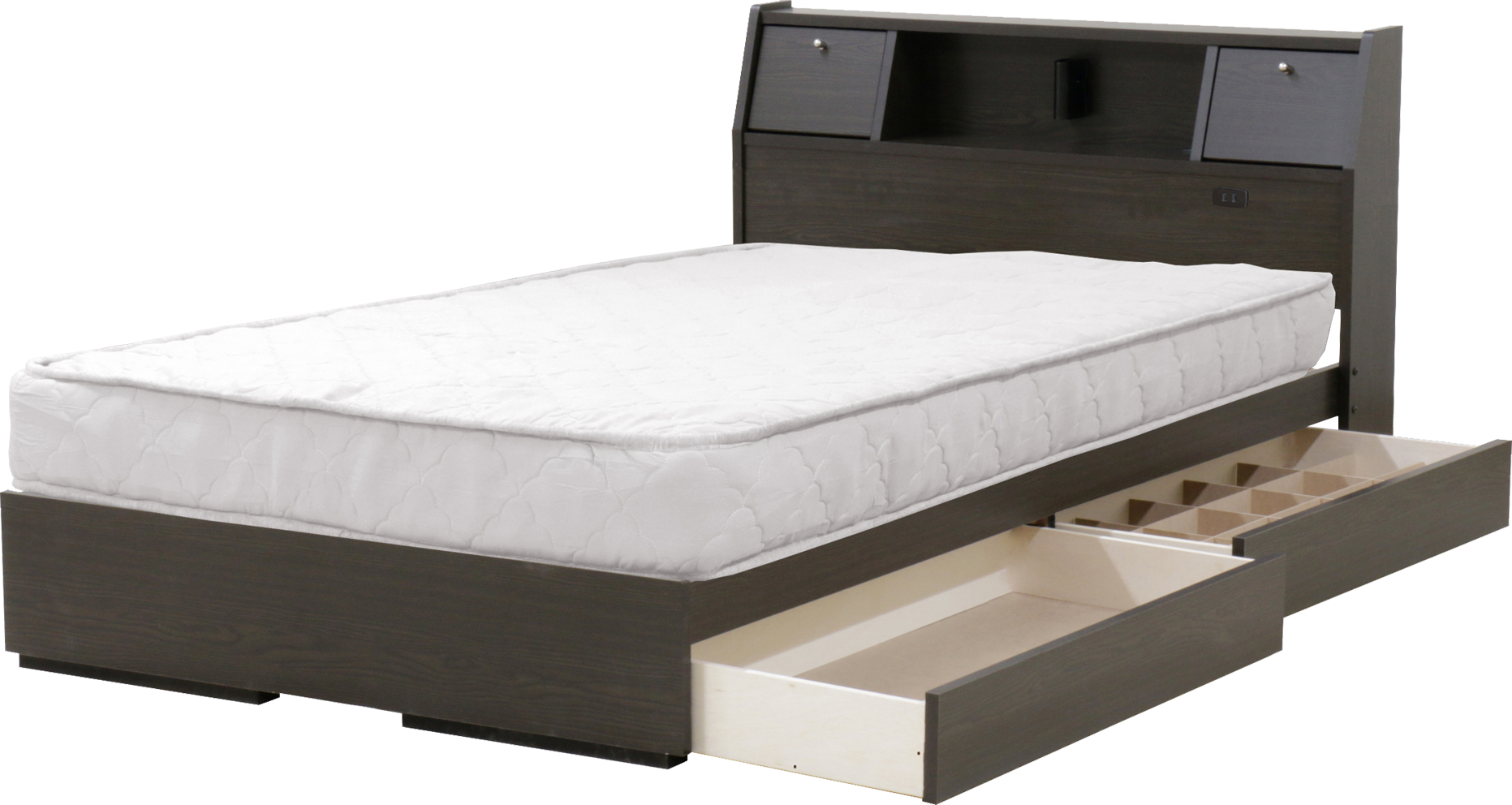 ヘッドボードにフラップテーブル、照明、コンセント、収納棚が付き、足元には引出しも付いた機能満載ベッド。床下引き出しには間仕切りが付き、小物を片付けるのに便利です。フレームは安心の日本製です。