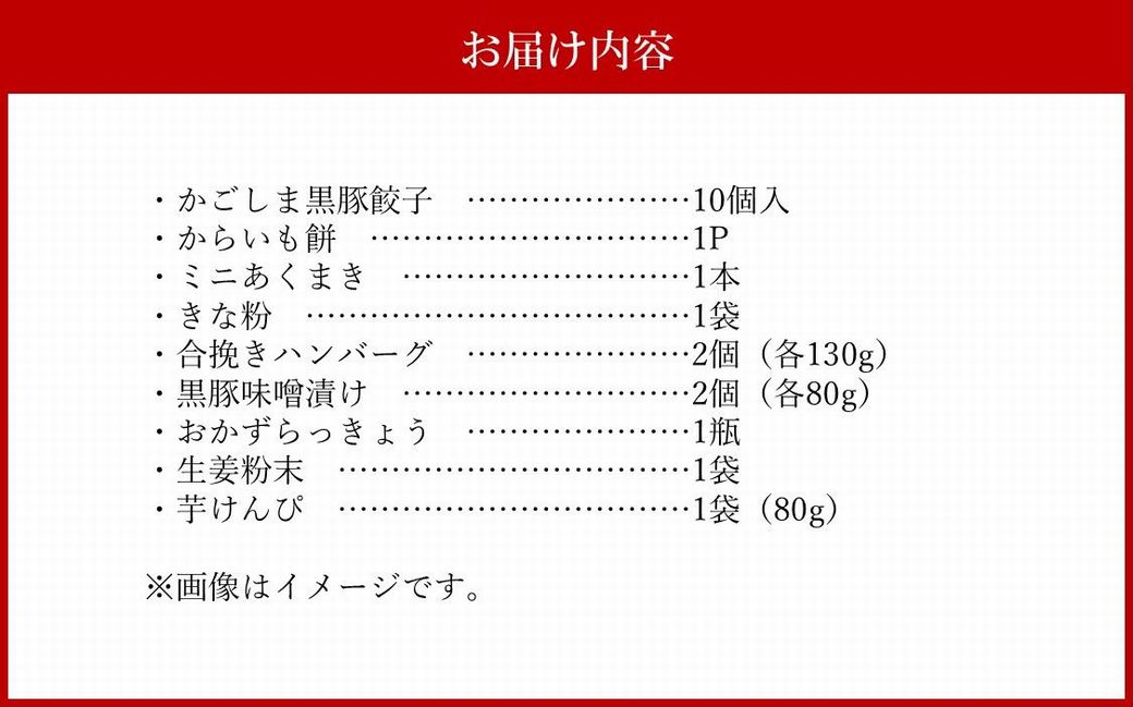 ■かごしま黒豚餃子:豚肉(鹿児島県産黒豚)、野菜(キャベツ(鹿児島県産)、ニラ(宮崎県産)、ネギ(鹿児島県産)、玉ネギ、ニンニク(鹿児島県産))、皮(小麦粉、澱粉)、ばれいしょ澱粉、てんさい糖、生醤油、塩、胡椒/調味料(アミノ酸等)