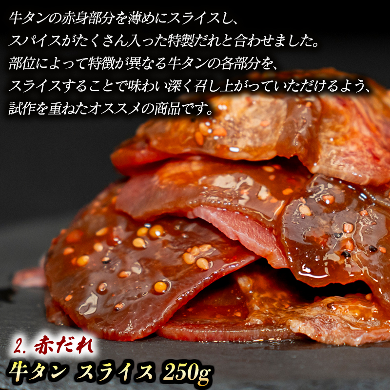 牛タンスライス(赤だれ):牛タンの赤身部分を薄めにスライスし、スパイスがたくさん入ったたれと合わせました。