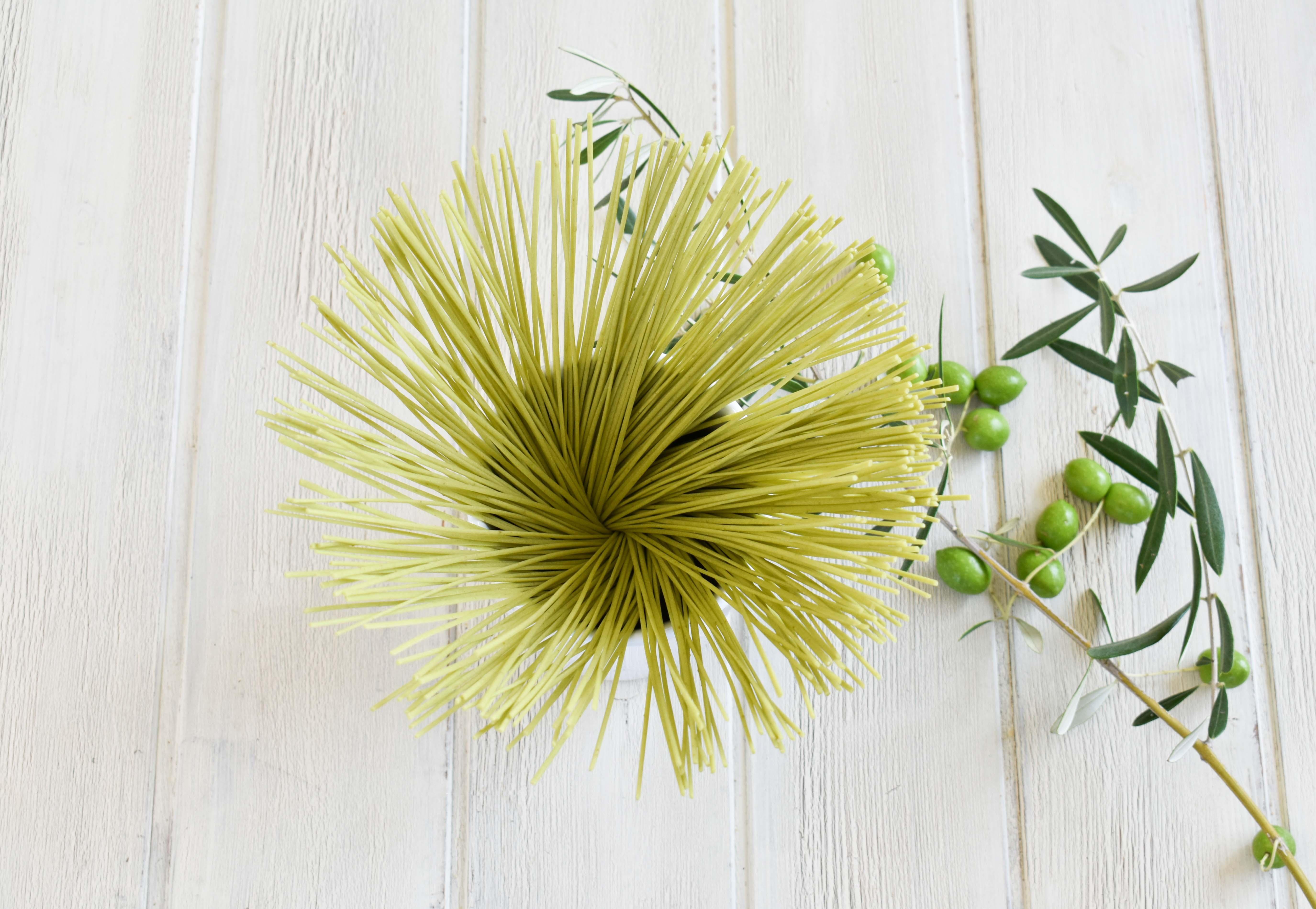 手延べオリーブパスタは、オリーブ果実を練りこんだ緑のパスタ。